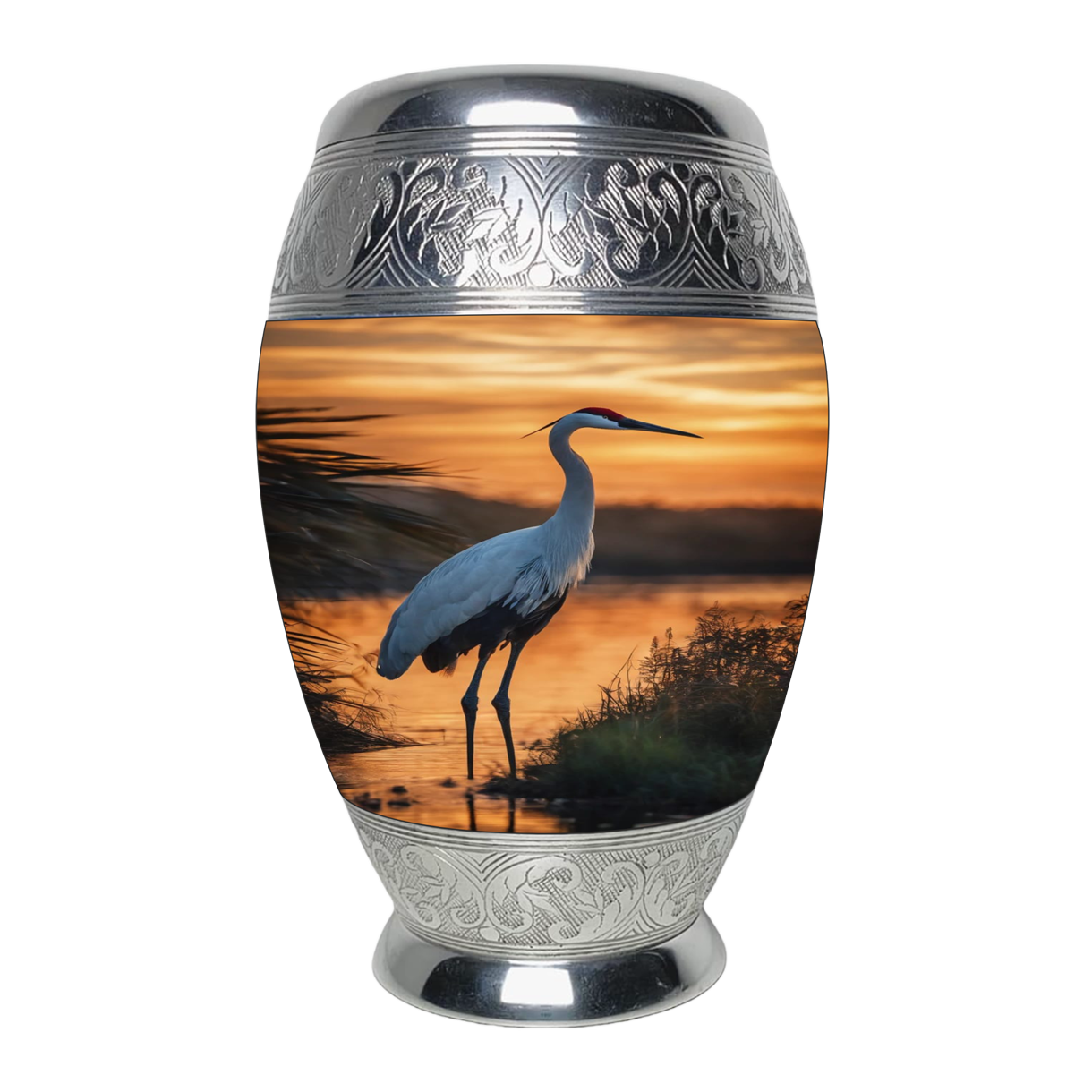The Crane Urn features the image of a majestic waterfowl crane at sunset with metal accents. It has a threaded top closure. It is available in both the Full-size and Keepsake versions.